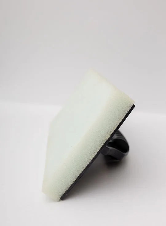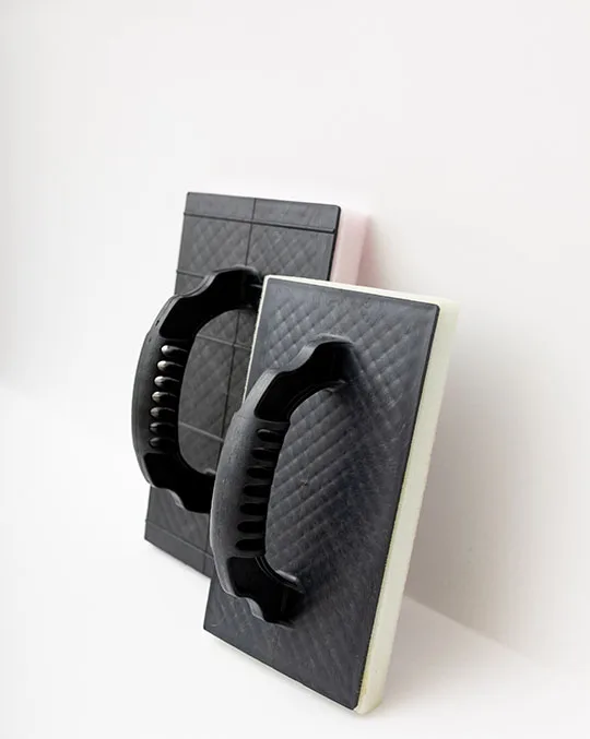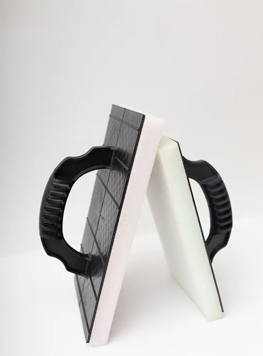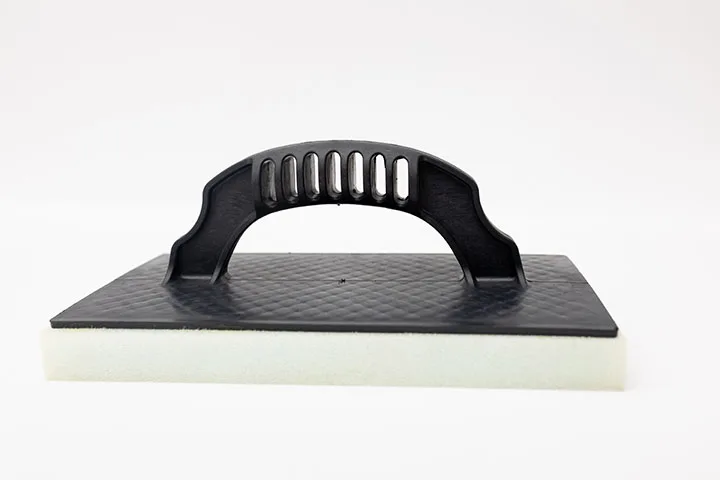 Base plástica con superficie antideslizante, una esponja adherida para tareas de limpieza o terminación, y un mango ergonómico integrado. Su diseño permite un agarre firme y un uso eficiente en trabajos prolongados.