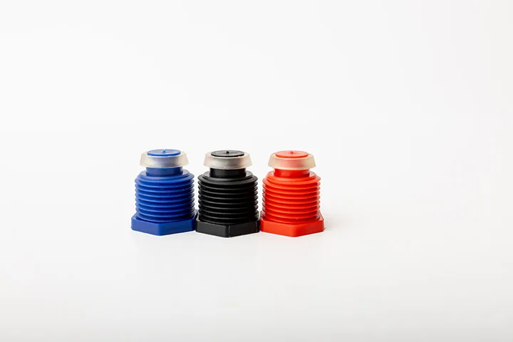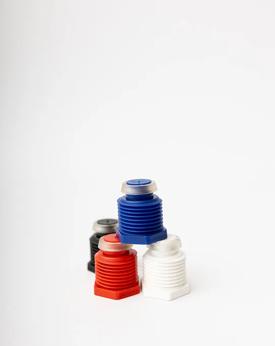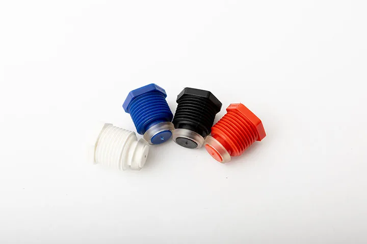 Tapón técnico roscado fabricado en plástico de alta resistencia con base metálica superior, incorpora una válvula antirretorno para evitar el retroceso de líquidos o gases. Su diseño compacto y funcional lo hace ideal para aplicaciones industriales que requieren control unidireccional de flujo.